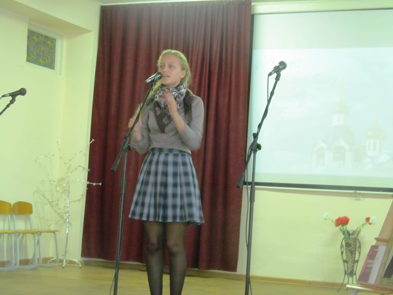 Жюри, в состав которого вошли учителя ОПК, методисты РМК, культработники, выслушало выступление 15 чтецов. Ребята искренне и с воодушевлением читали произведения православных авторов разных лет. В младшей возрастной группе диплома первой степени удостоена самая юная участница — семилетняя Ксюша Бардак, воспитанница ансамбля «Вифлеем» Свято-Покровского храма, проникновенно прочитавшая стихотворение «Пресвятая Богородица» иеромонаха Романа. В старшей возрастной группе победили две участницы: Липовая Анастасия, учащаяся 8 класса СОШ №3 и Зайцева Дарья , участница православного ансамбля «Вифлеем».
