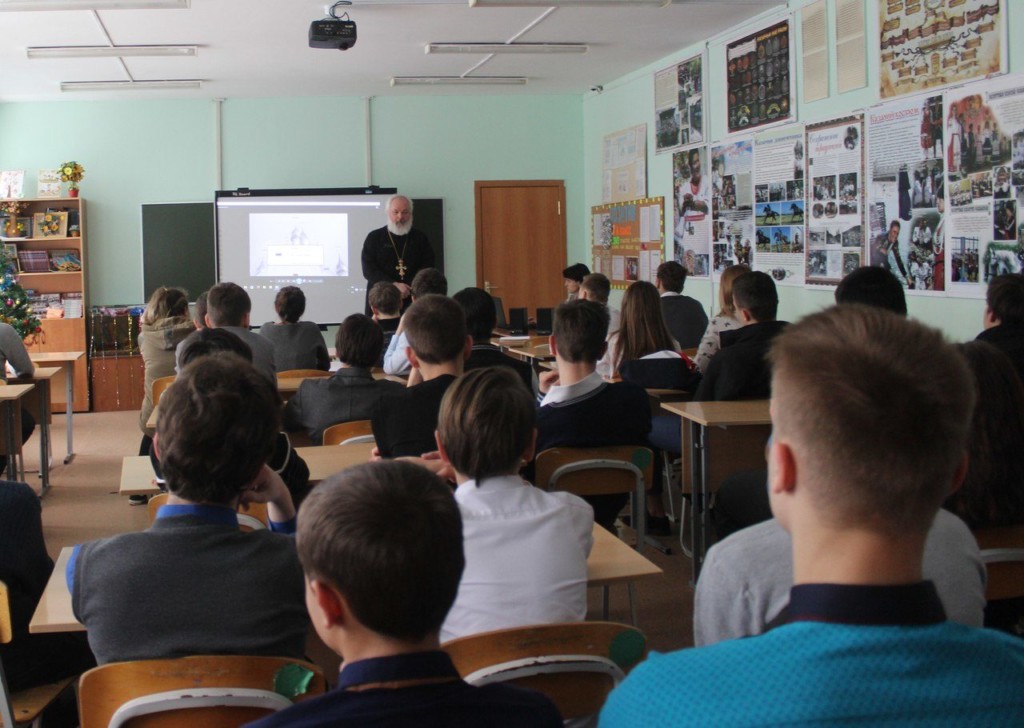 Протоиерей Алексий ответил на вопросы старшеклассников и поздравил всех участников мероприятия с праздником Святого Богоявления.
