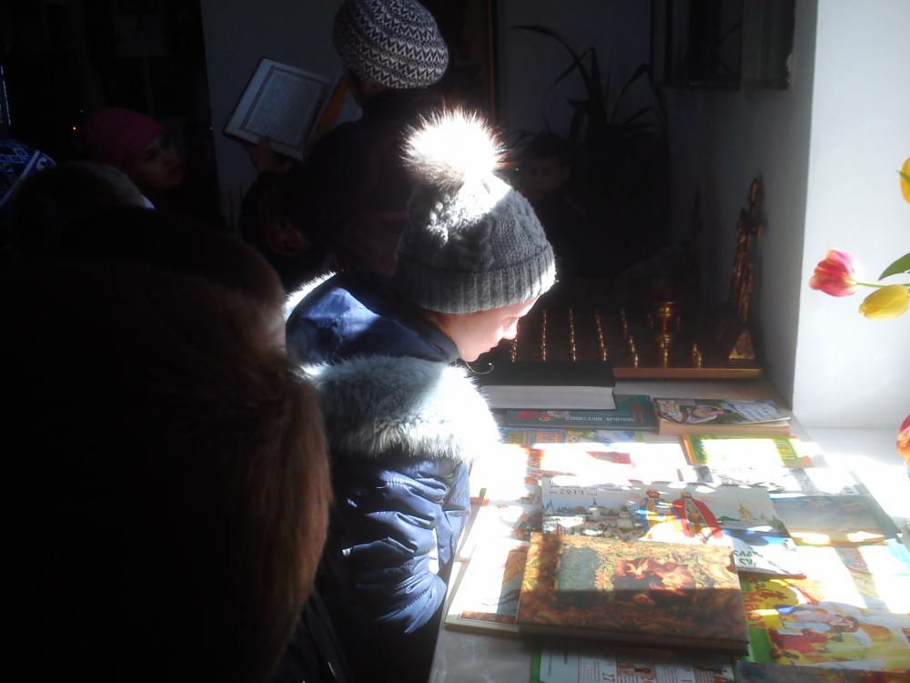 Ребята с интересом рассматривали старинные богослужебные книги, хранящиеся в храме, и задавали вопросы на различные темы.