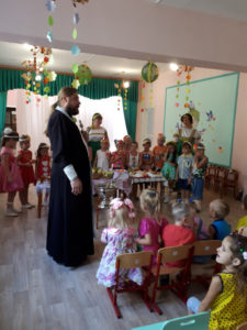 Штатный священник храма Покрова Пресвятой Богородицы иерей Дионисий Севрук побывал в ДОУ № 2, 15,133, настоятель Свято-Троицкого храма иерей Александр Виноградов в ДОУ №4, 6, 16, 28. Штатный священник храма Казанской иконы Божьей Матери иерей Николай Слынько посетил детский сад №8 в ст. Канеловской, а настоятель храма святителя Луки иерей Евгений Калий ДОУ №5.