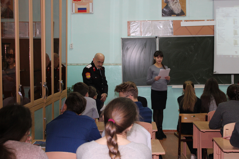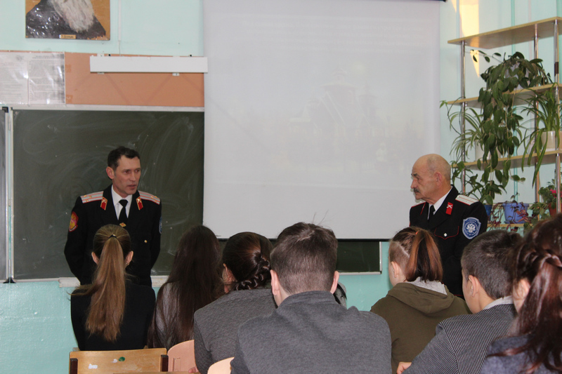Со вступительным словом к учащимся обратился казачий наставник Панин В.П., а школьники подготовили краткие выступления по теме урока.
