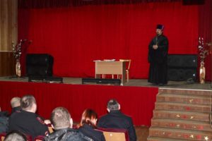 18 апреля иерей Дионисий Севрук, помощник благочинного по взаимодействию с органами внутренних дел, провел беседу с личным составом РОВД на тему предстоящих пасхальных праздников, а также о гуманизме православной веры, который сотрудники должны применять не только на службе, но в быту, в отношении своей семьи.