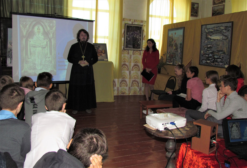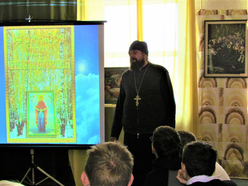 Ребята внимательно слушали священника, задавали вопросы. Иерей Дионисий в завершении беседы поздравил учащихся и педагогов с предстоящим праздником и пожелал им покровительства Матери Божьей в учении.