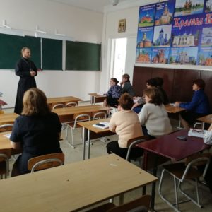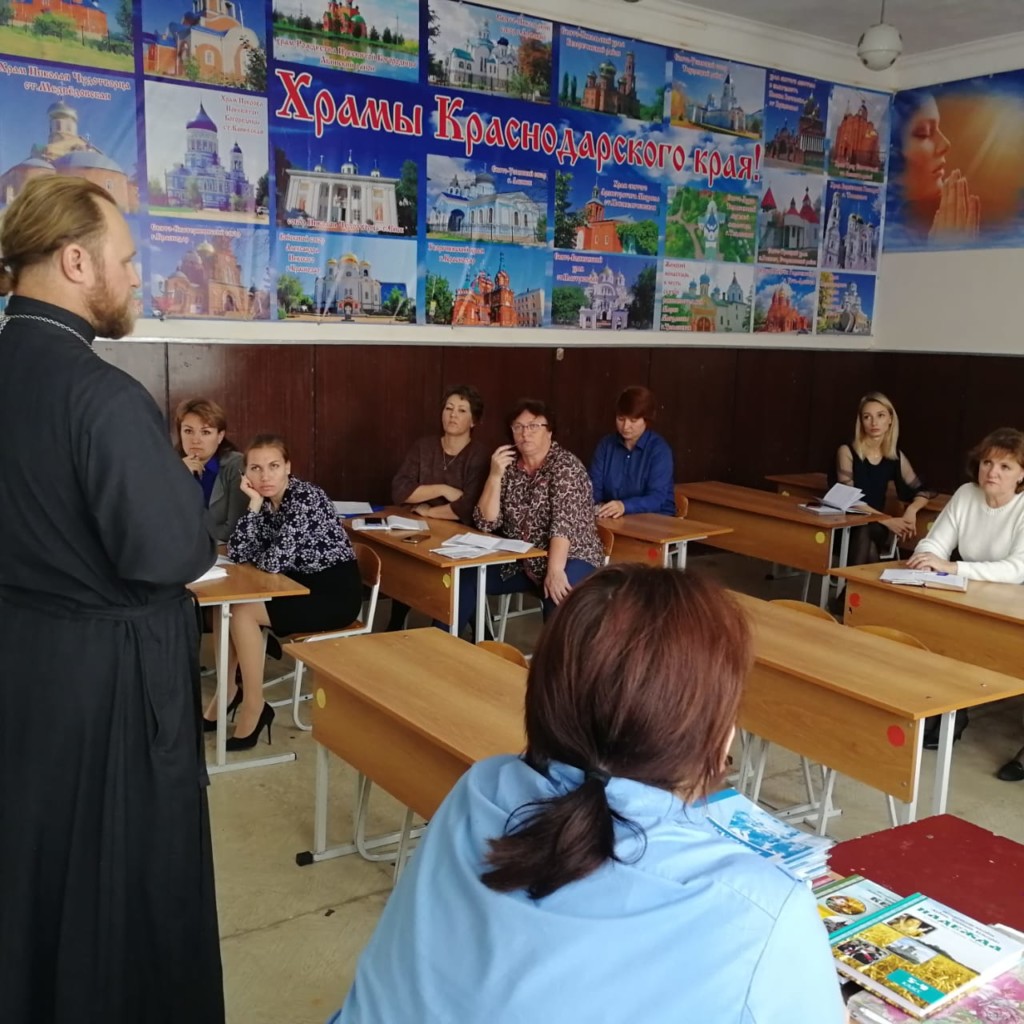 А сразу после уроков священник принял участие в совещании классных руководителей, на котором обсудили практические вопросы взаимодействия по ведению часов духовности, а также некоторые аспекты в различии Православной и светской педагогики. Батюшка и педагоги обменялись контактами, поближе познакомились с новыми коллегами, наметили планы на ближайшее время.