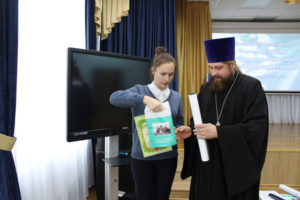 Иерей Николай Слынько выполнил почетную миссию и вручил Архиерейские грамоты победителям епархиального этапа Международного детского конкурса «Красота Божьего мира»: Горб Полине, учащейся детско-художественной школы, занявшей 3- место в «Основной номинации» за работу «Маршал Жуков на параде Победы» (педагог Назарова Елена Викторовна) и Смородкиной Алене, учащейся студии «Молодые голоса Дома детского творчества, занявшей второе место в номинации «Рассказ» за работу «Сталинградская битва»( педагог Букурова Елена Анатольевна).