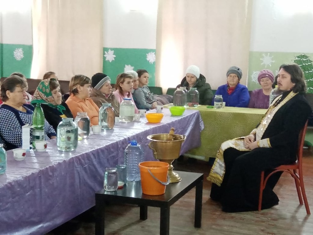 18 января, в Крещенский Сочельник, штатный священник храма Покрова Пресвятой Богородицы ст. Староминской иерей Дионисий Севрук с матушкой Мариной посетили жителей ст. Новоясенской. Встреча проходила в станичном Доме культуры. Священник провел беседу о двунадесятом празднике Крещения Господня, о святой воде и традициях его празднования.