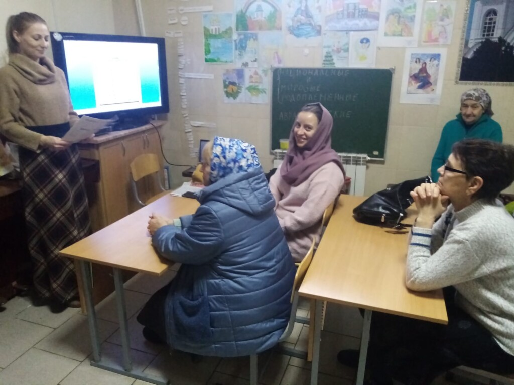 В это воскресенье педагог Романченко Ольга Александровна подготовила для слушателей лекцию о мировых религиях. После и теоретической части взрослые ученики остаются на чаепитие и в свободной атмосфере общаются со священником, обсуждая различные вопросы приходской жизни.