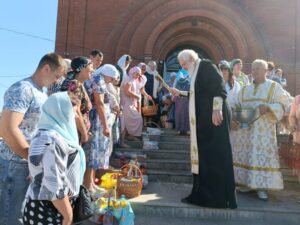 Настоятель во дворе храма совершил освящение яблок и других плодов нового урожая, которые принесли прихожане на праздник Преображения Господня. Люди несут в храм дары лета, плоды трудов своих для благословения и в знак благодарности Богу. Отец Алексей щедро окроплял плоды и всех собравшихся святой водой, чему прихожане очень радовались.
