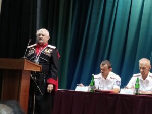 С отчетным докладом выступил войсковой старшина атаман РКО Владимир Горб. В своём выступлении атаман отметил, что казаки общества и духовенство проводят большую работу по духовному и патриотическому воспитанию казачат в казачьих школ МБОУ №5 и МБОУ №10, в классах казачьей направленности и в казачьем детском саду №8,в летний период на детской площадке «Купель» при Свято-Покровском храме.