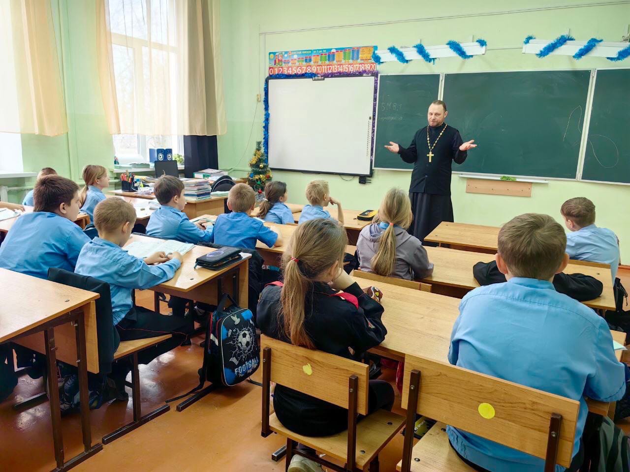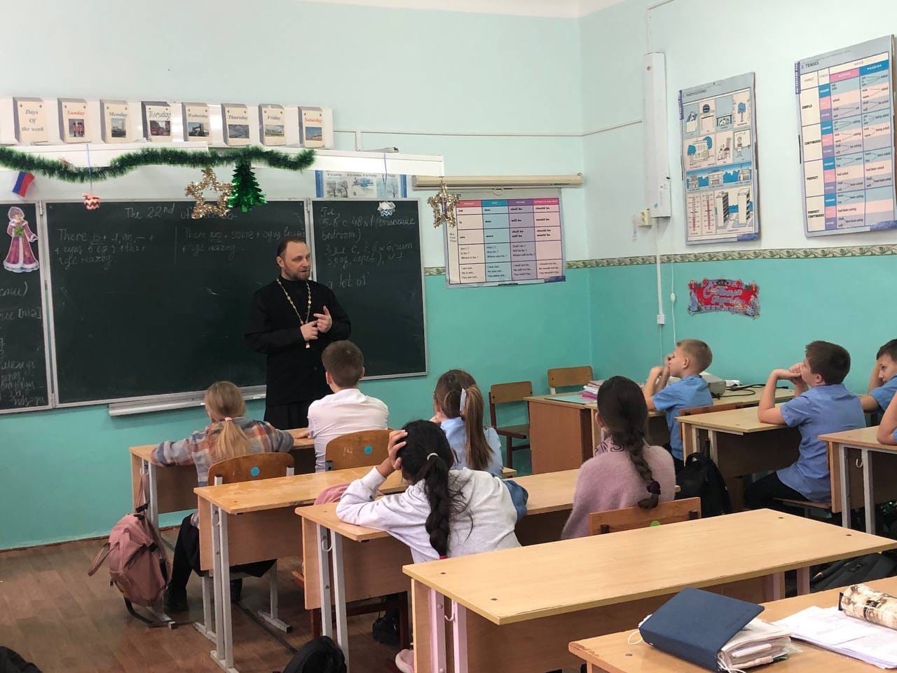 В 5-а классе священник поговорил с детьми о необходимости уважительного отношения друг к другу, о сохранении человеческого достоинства, о соблюдении христианских заповедей.
