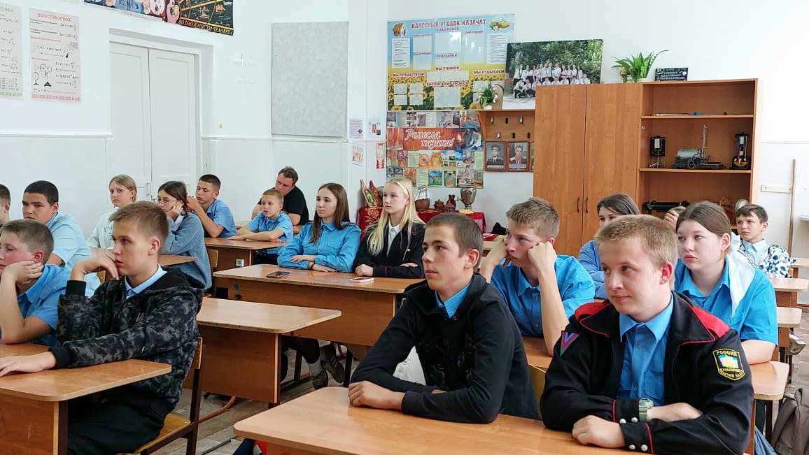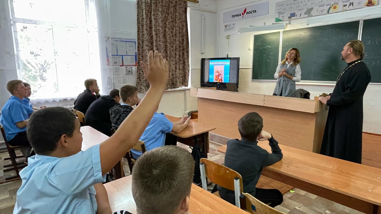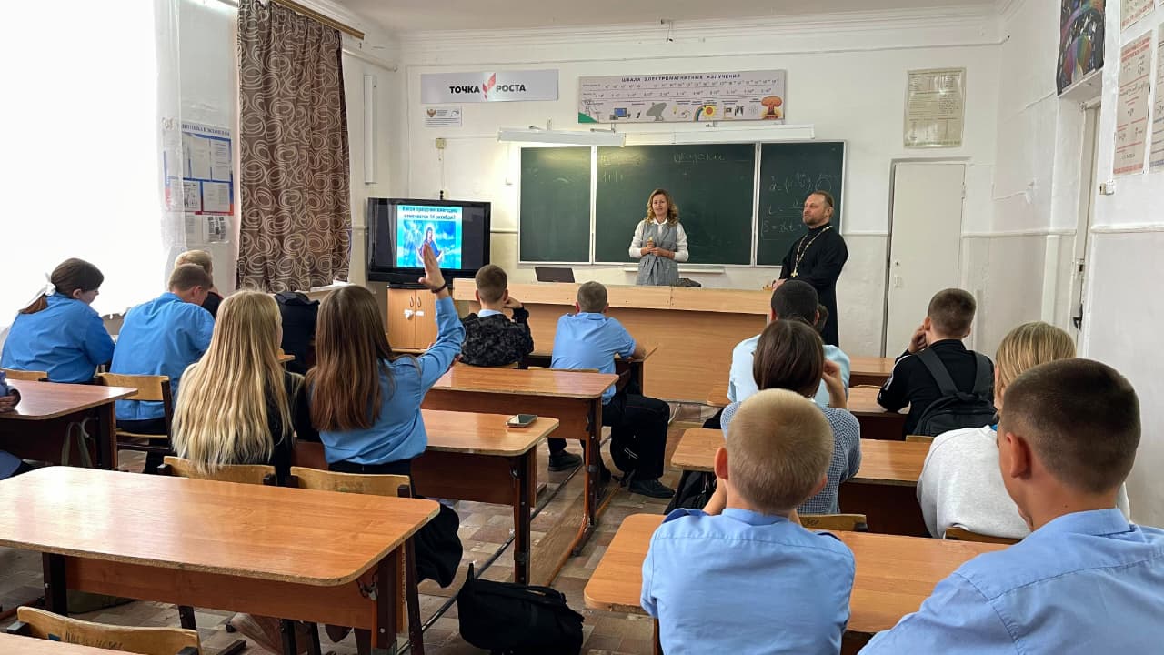 В казачьей средней школе 5 имени А. И. Майстренко специалистом Молодежного центра Павленко Ольгой и настоятелем храма Святой Троицы иереем Александром Виноградовым проведена интерактивная викторина, приуроченная к празднику Воздвижения Честного Животворящего Креста Господня. Ребята, разделившись на две команды, поочередно отвечали на вопросы викторины, касающиеся темы церковных праздников.