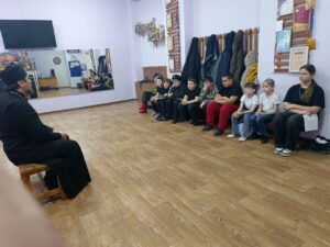 В канун праздника Сретения Господня с ребятами встретился священник храма Покрова Пресвятой Богородицы иерей Дионисий Севрук, который рассказал ребятам о празднике, напомнил о верности казаков вере православной и Отечеству. Священник рассказал ребятам о Таинствах Церкви и пригласил в храм на службу. В день празника ребята вместе со своим наставником Сергань Александром и родителями участвовали в праздничной Литургии, многие ребята исповедовались и причастились.