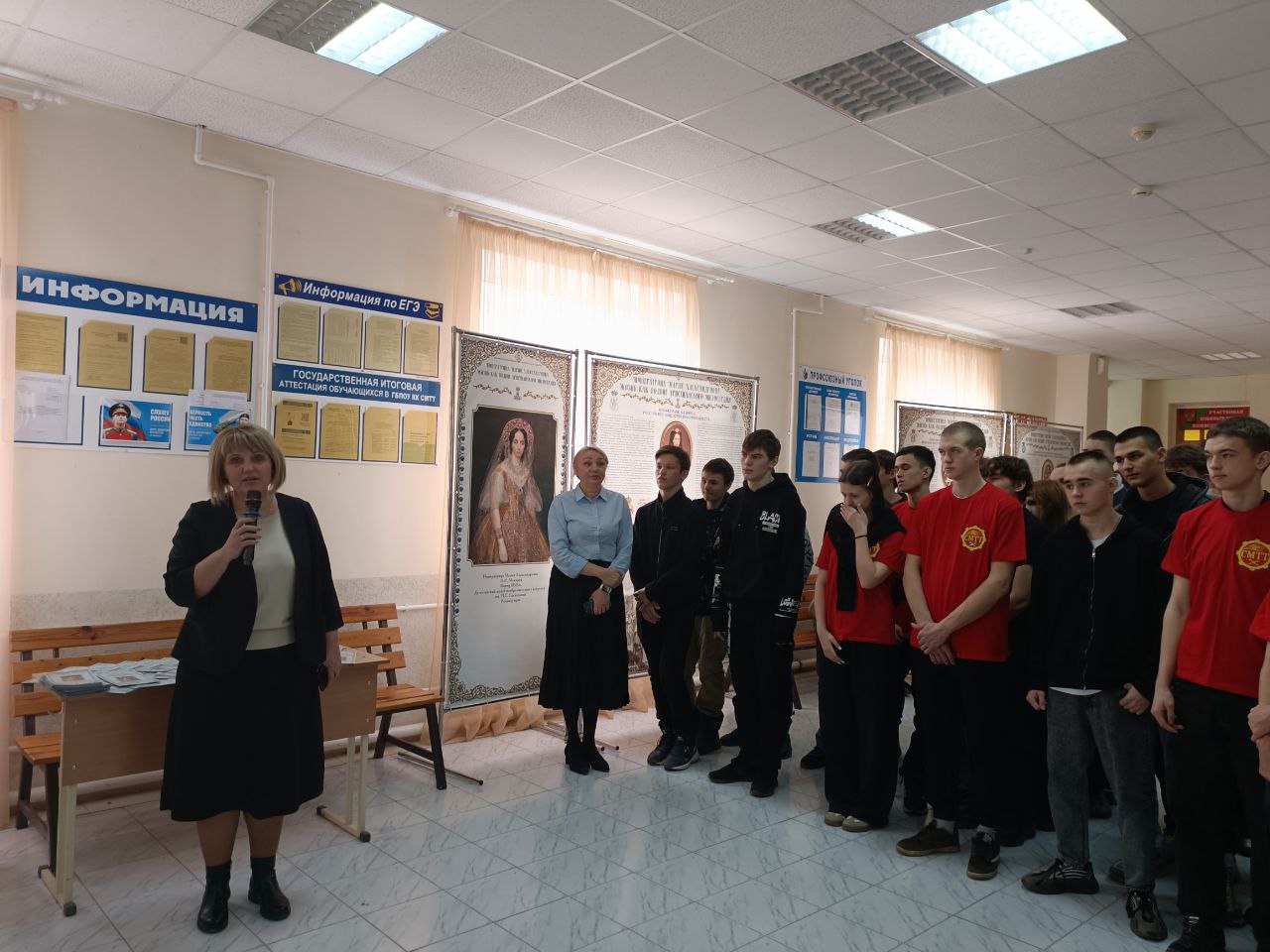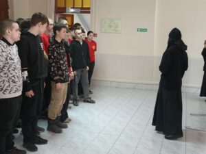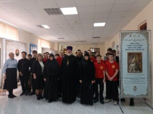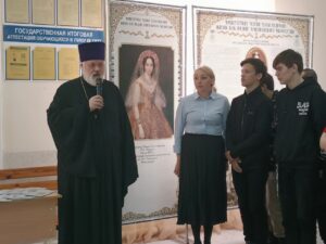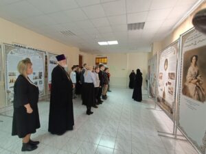 Первыми посетителями выставки стали студенты техникума, которые с большим интересом и вниманием слушали экскурсовода — матушку Серафиму, её рассказ о жизненном пути и подвиге милосердия императрицы Марии Алексадровны, настоящей патриотке России.