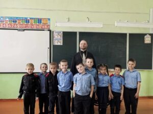 В Светлый вторник настоятель храма Святой Живительной Троицы иерей Александр Виноградов провёл час православия в первом классе казачьей СОШ №5 п. Рассвет.